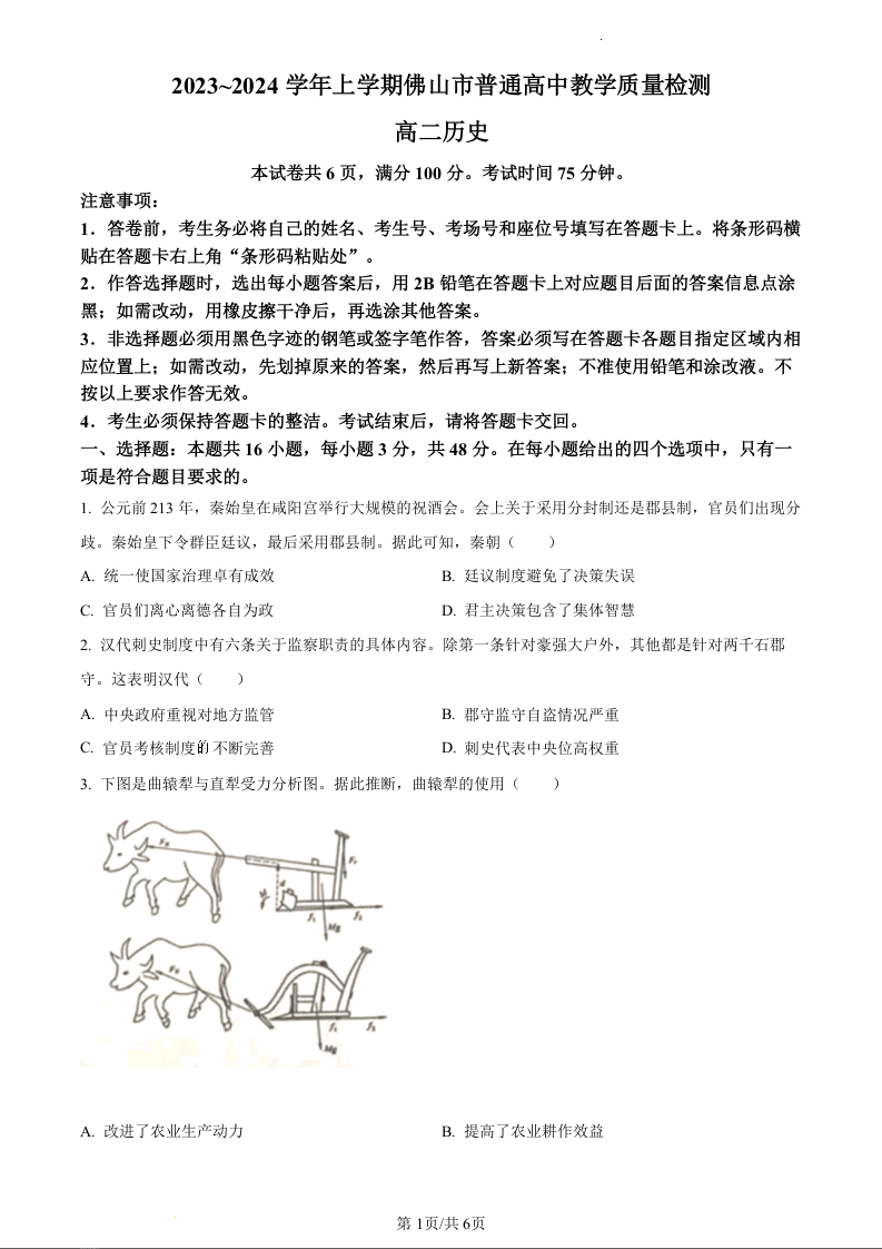 广东省佛山市2023-2024学年高二上学期期末教学质量检测历史(原卷版)