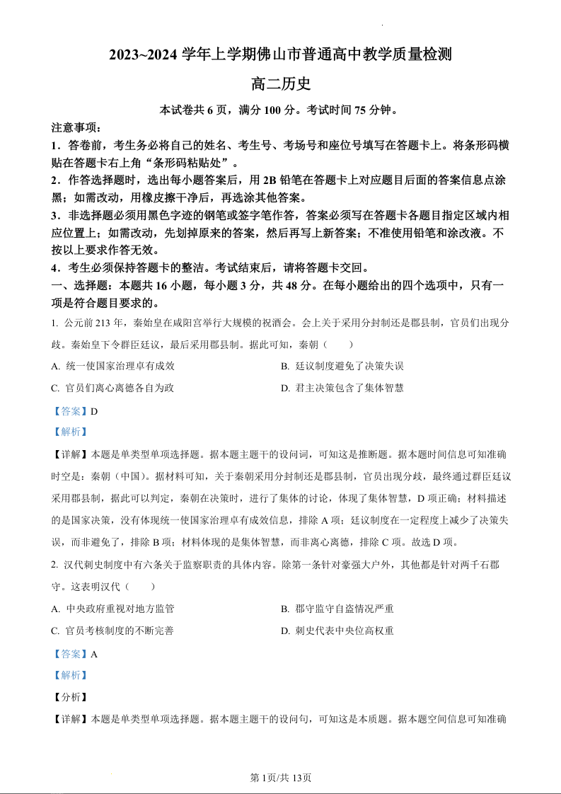 广东省佛山市2023-2024学年高二上学期期末教学质量检测历史(精品解析版)