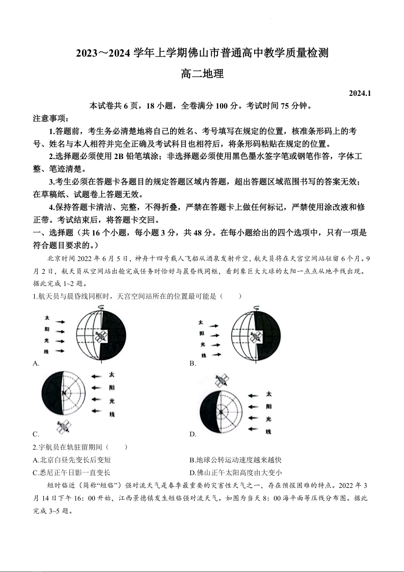 广东省佛山市2023-2024学年高二上学期期末教学质量检测地理