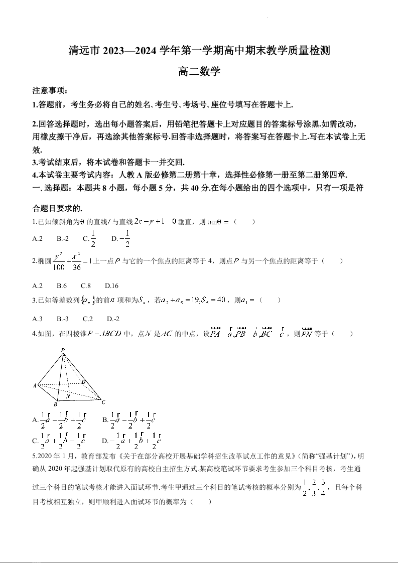 广东省清远市2023-2024学年高二上学期期末教学质量检测数学+答案