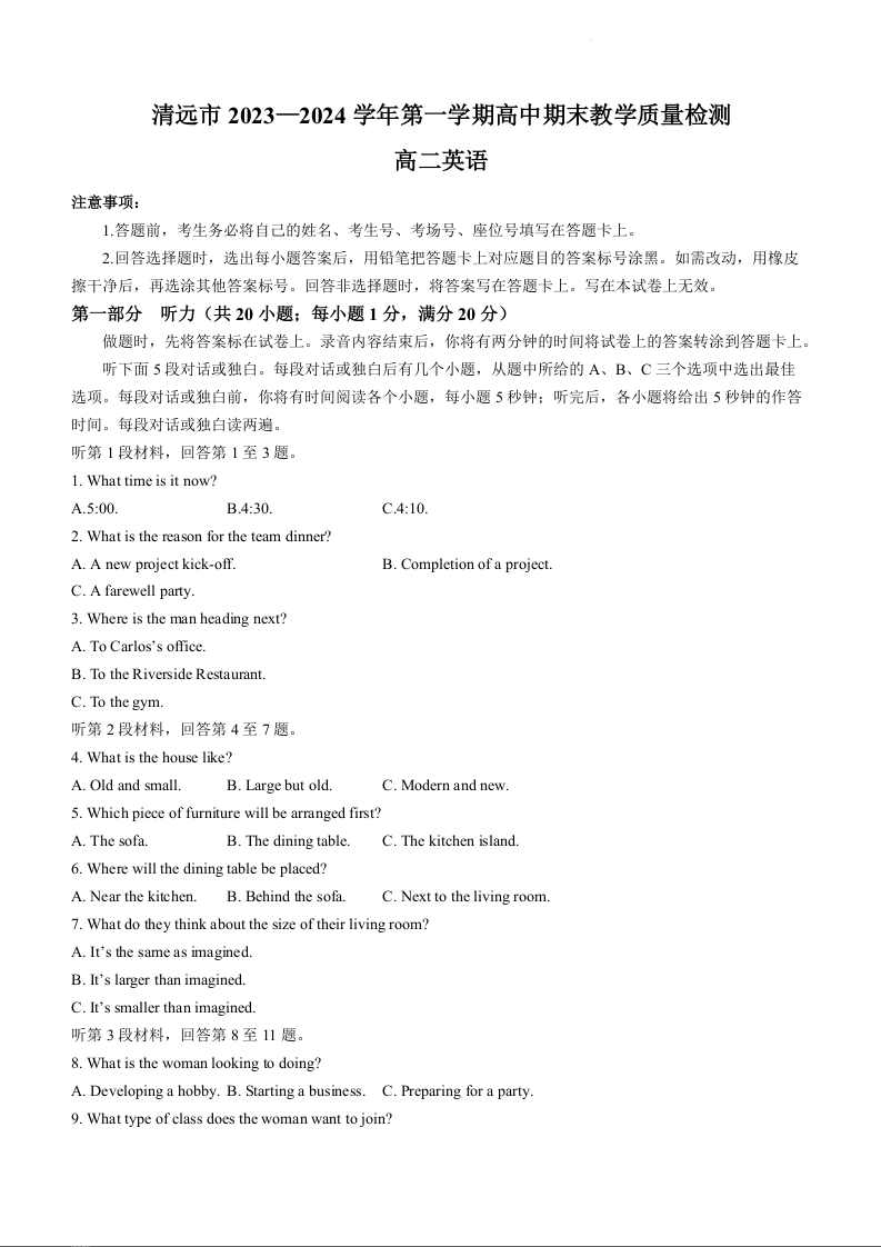 广东省清远市2023-2024学年高二上学期期末教学质量检测英语+答案