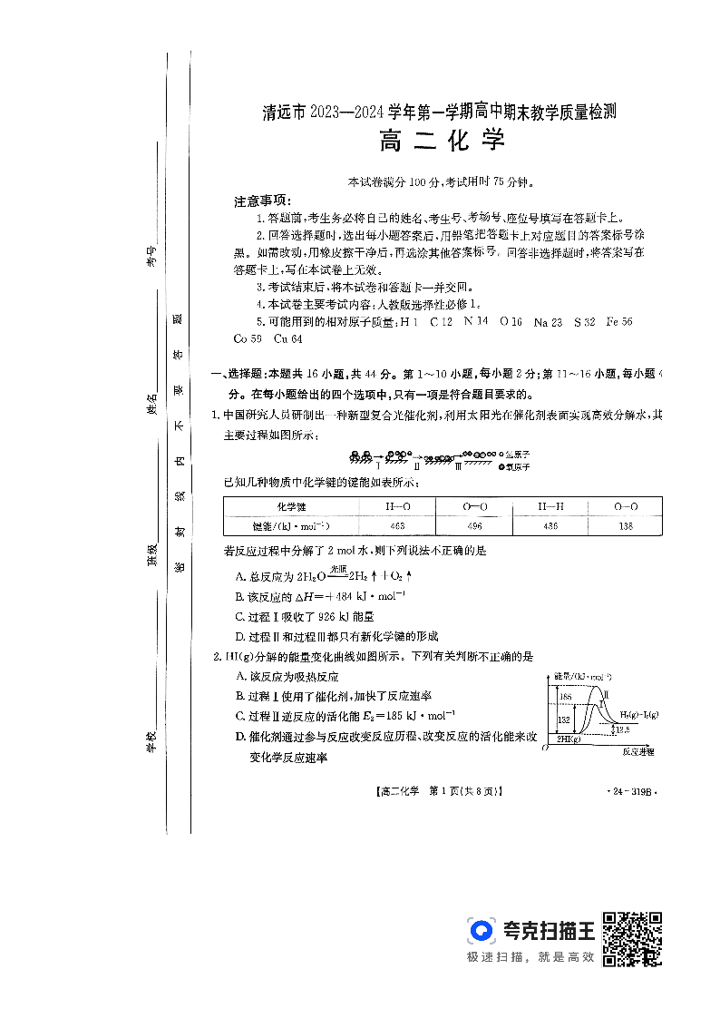 广东省清远市2023-2024学年高二上学期期末教学质量检测化学