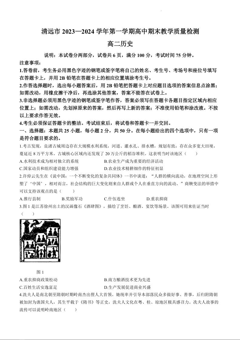 广东省清远市2023-2024学年高二上学期期末教学质量检测历史+答案