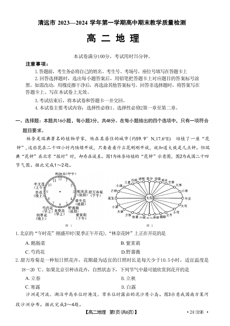广东省清远市2023-2024学年高二上学期期末教学质量检测地理+答案