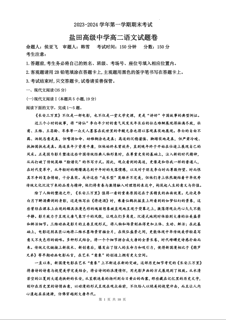 广东省深圳市盐田高级中学2023-2024学年高二上学期1月期末考试语文