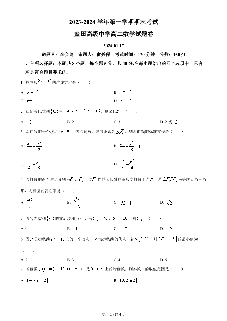 广东省深圳市盐田高级中学2023-2024学年高二上学期1月期末考试数学(原卷版)