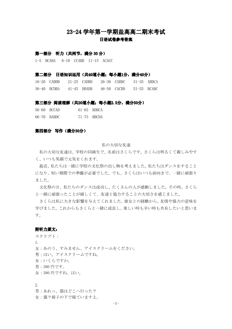 广东省深圳市盐田高级中学2023-2024学年高二上学期1月期末考试日语答案
