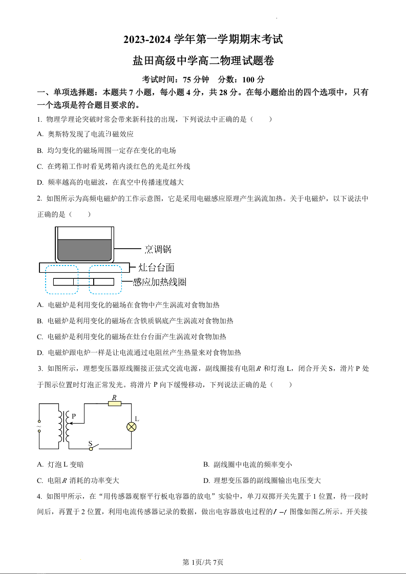 广东省深圳市盐田高级中学2023-2024学年高二上学期1月期末考试物理(原卷版)