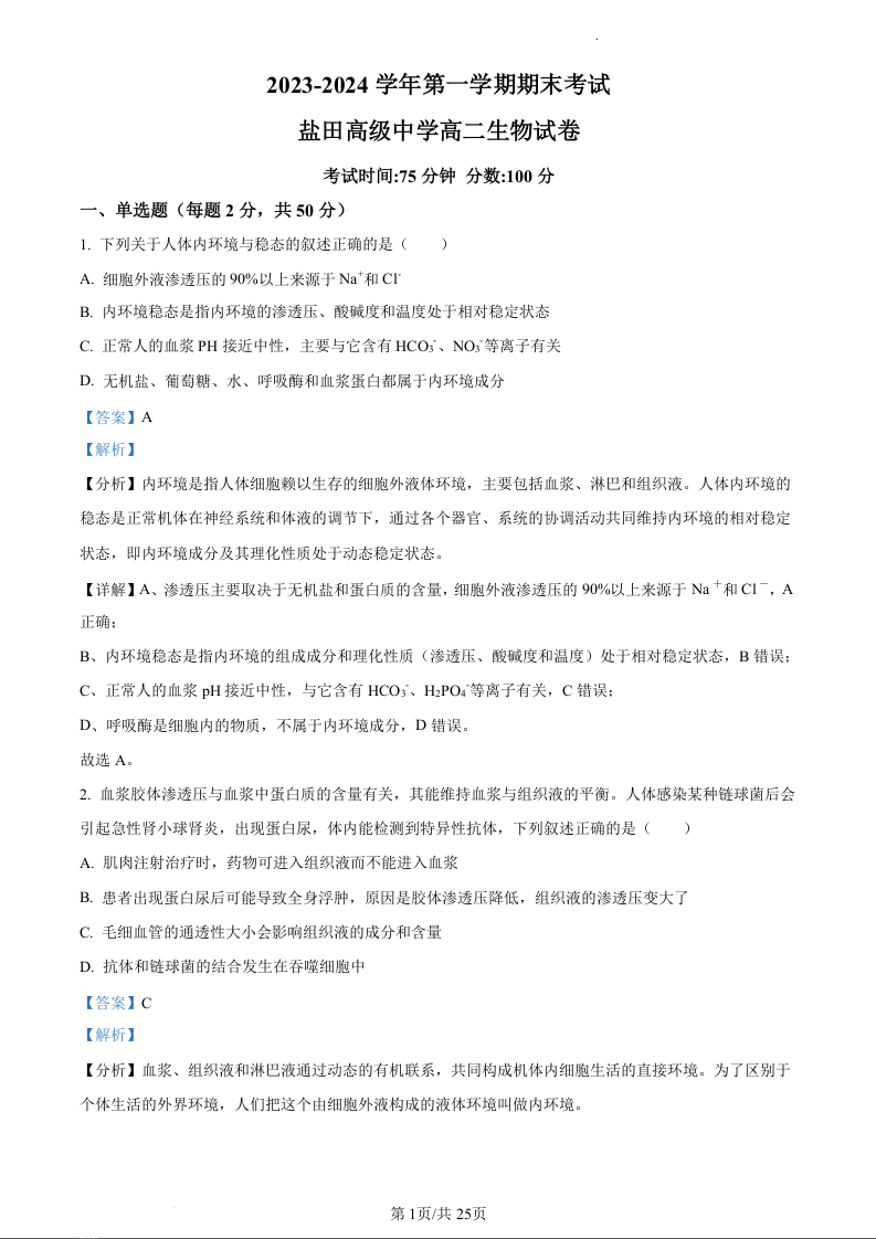 广东省深圳市盐田高级中学2023-2024学年高二上学期1月期末考试生物(精品解析版)