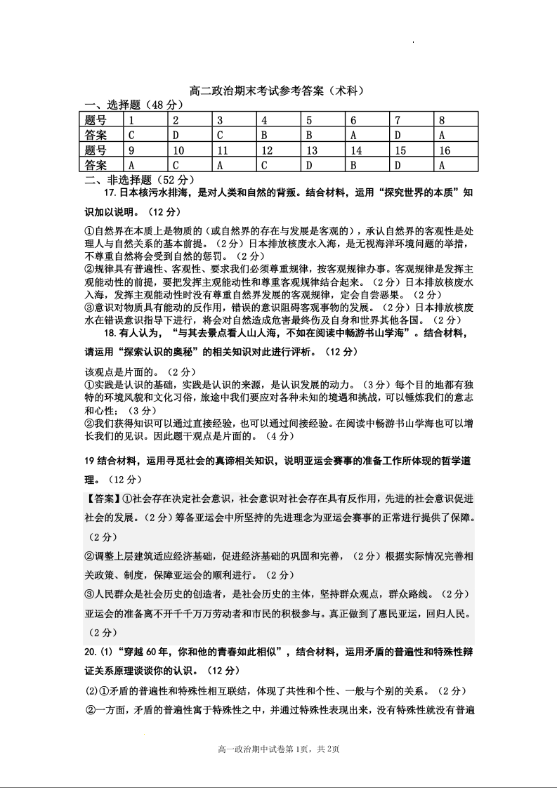 广东省深圳市盐田高级中学2023-2024学年高二上学期1月期末考试政治 答案