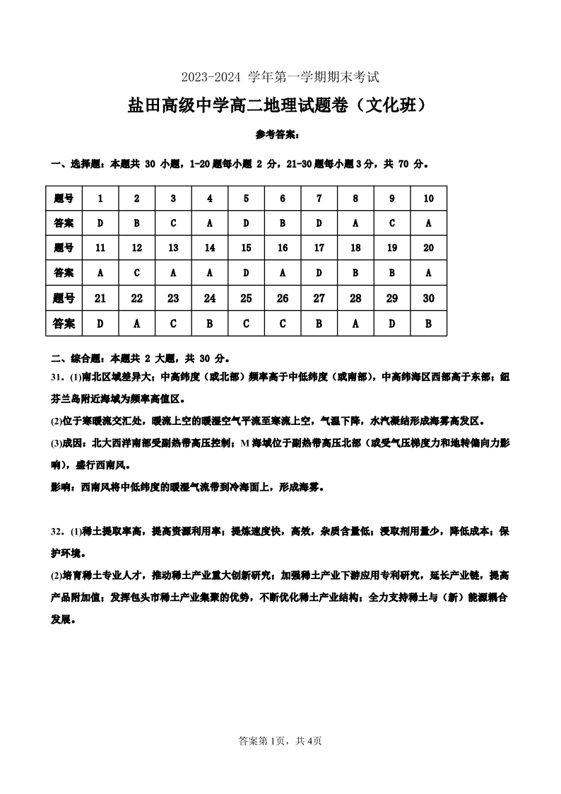 广东省深圳市盐田高级中学2023-2024学年高二上学期1月期末考试地理答案(文化班)