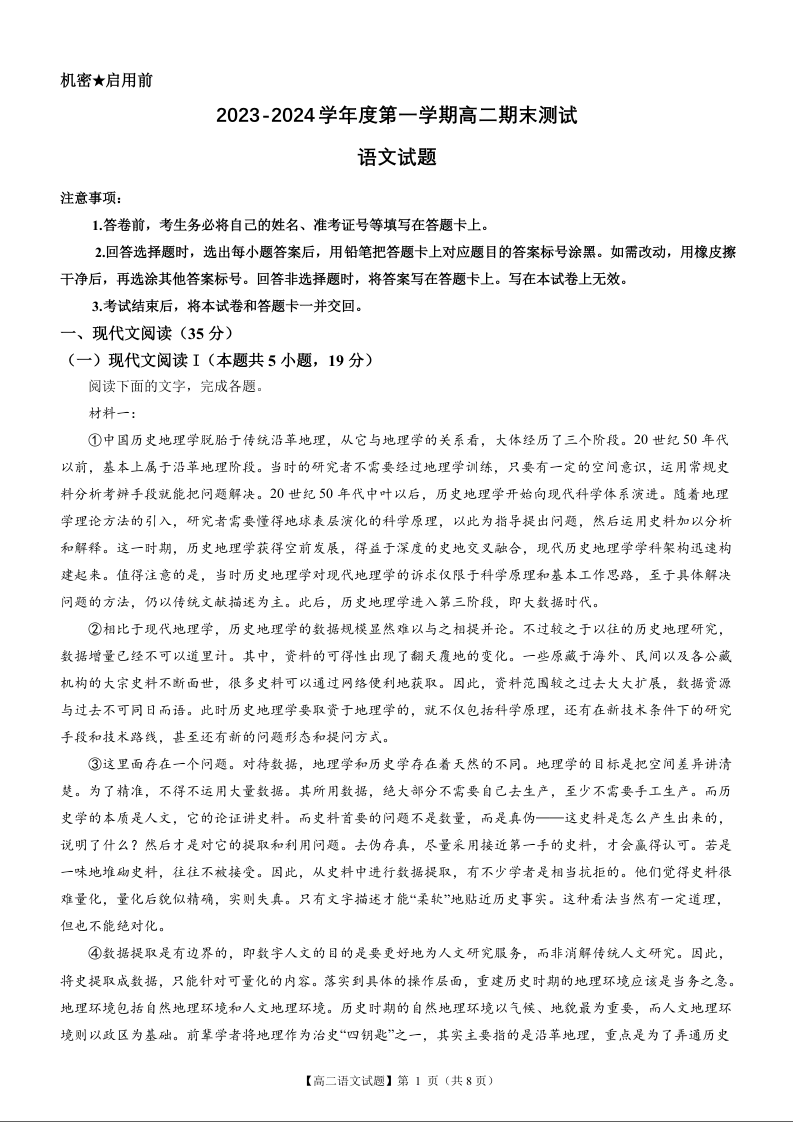 广东省阳江市2023-2024学年高二上学期1月期末考试语文+答案