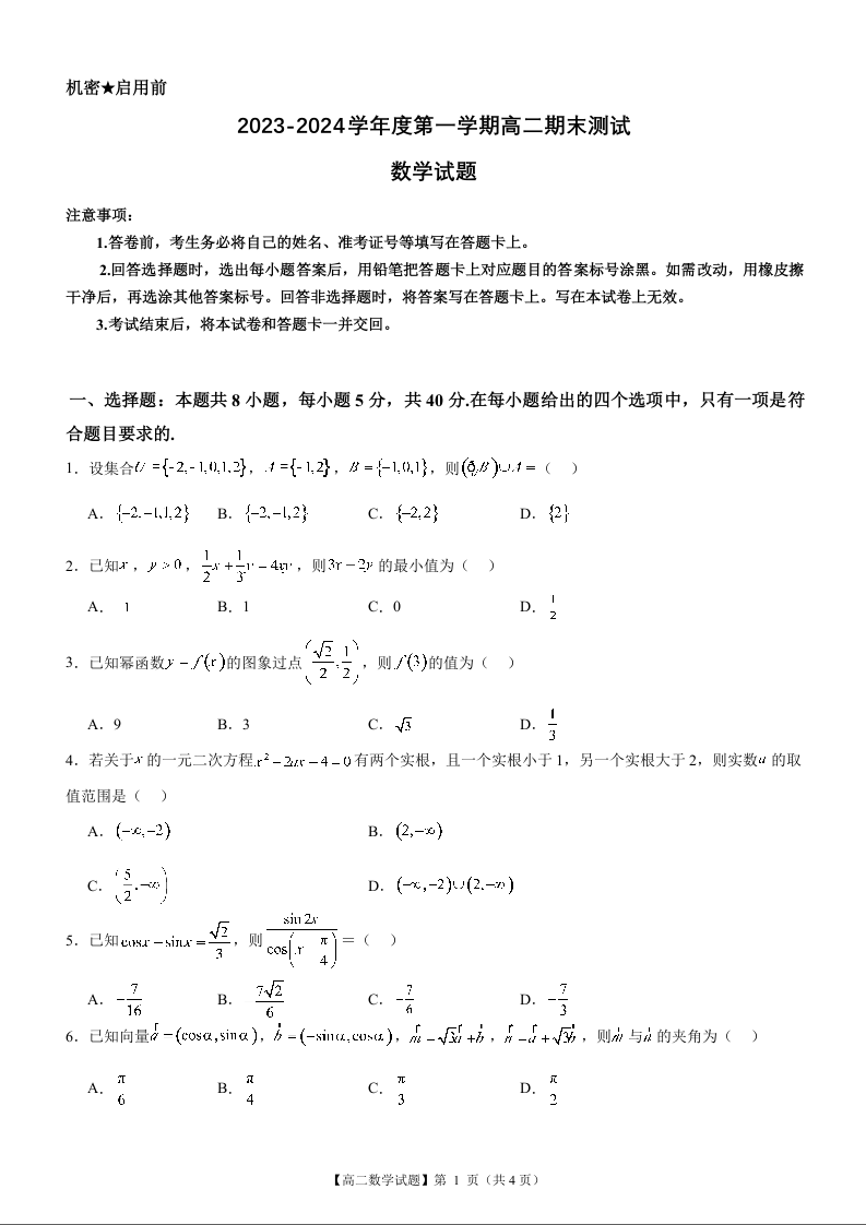 广东省阳江市2023-2024学年高二上学期1月期末考试数学+答案