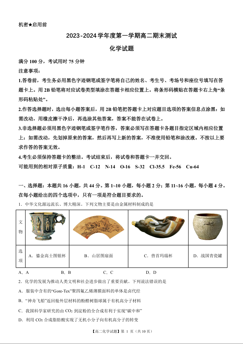 广东省阳江市2023-2024学年高二上学期1月期末考试化学+答案