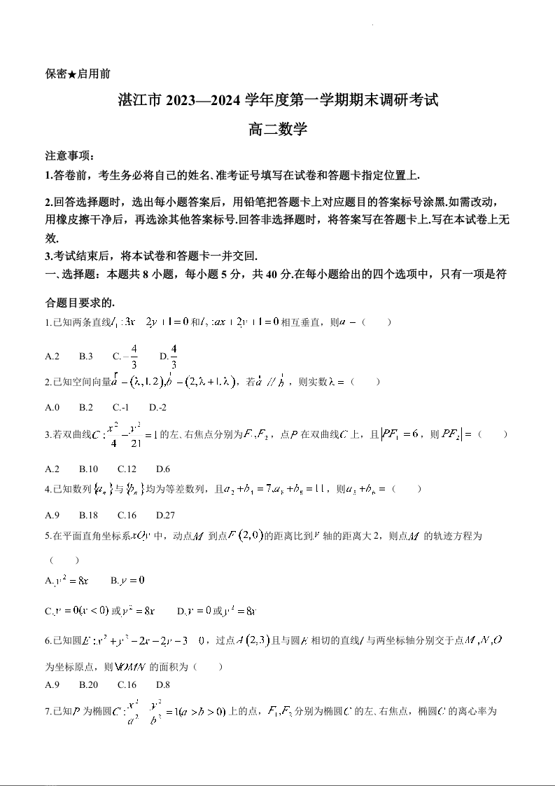 广东省湛江市2023-2024学年高二上学期期末考试数学+答案