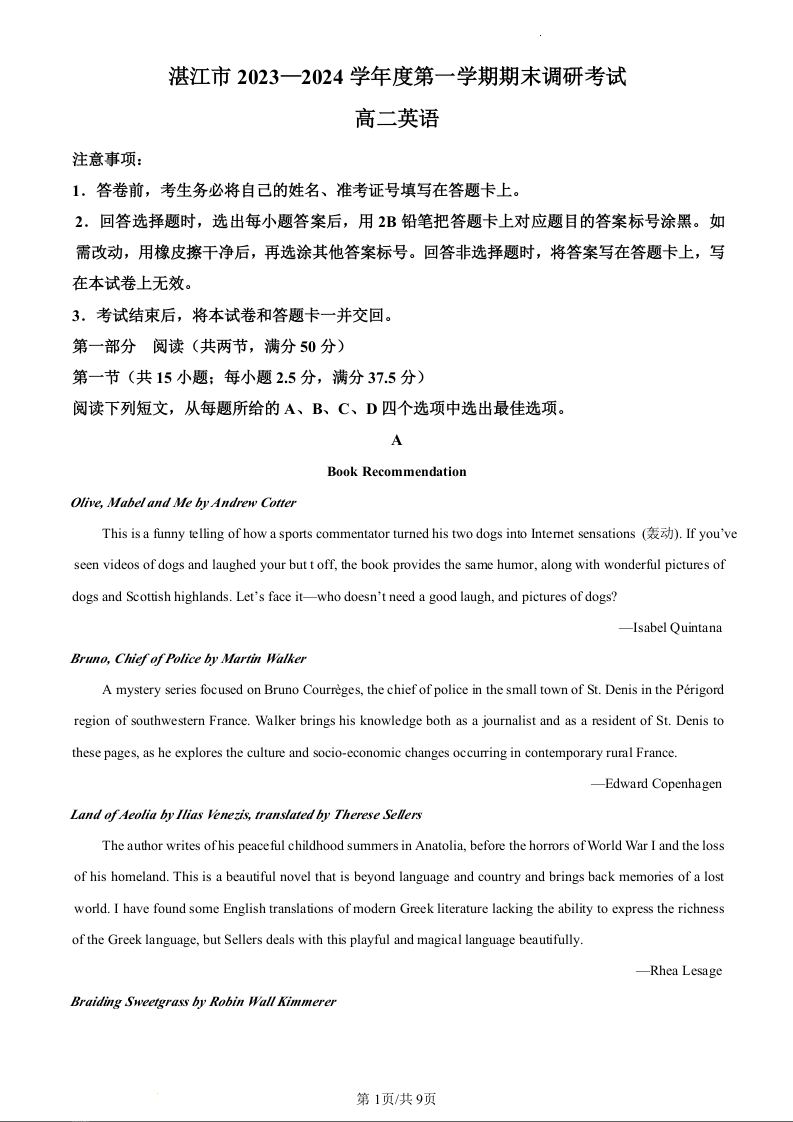 广东省湛江市2023-2024学年高二上学期期末考试英语(原卷版)