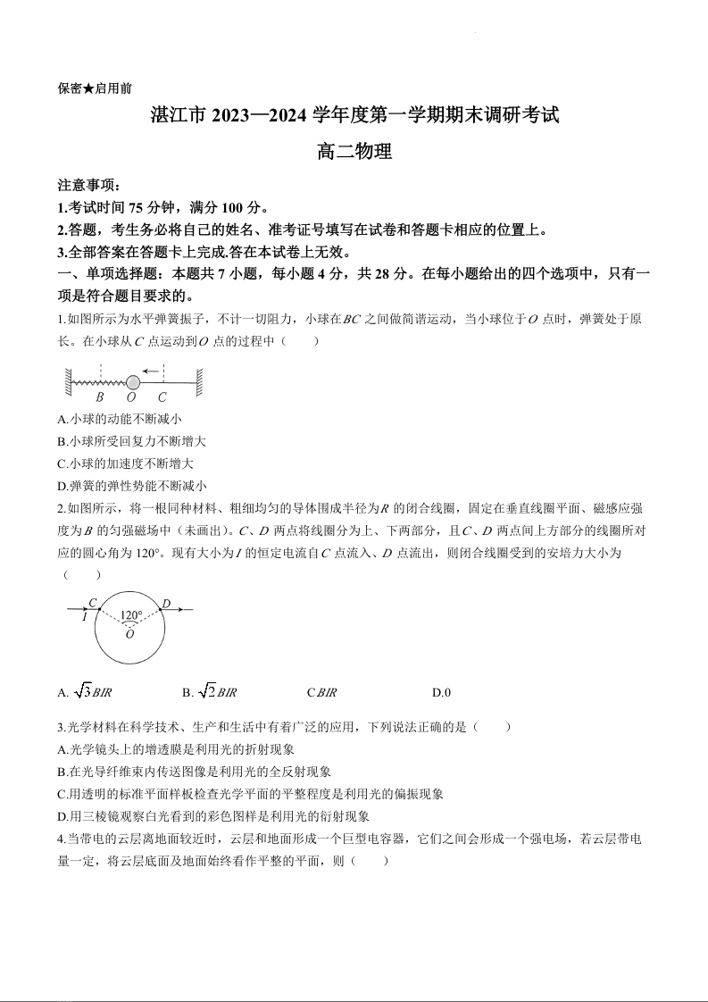 广东省湛江市2023-2024学年高二上学期期末考试物理+答案