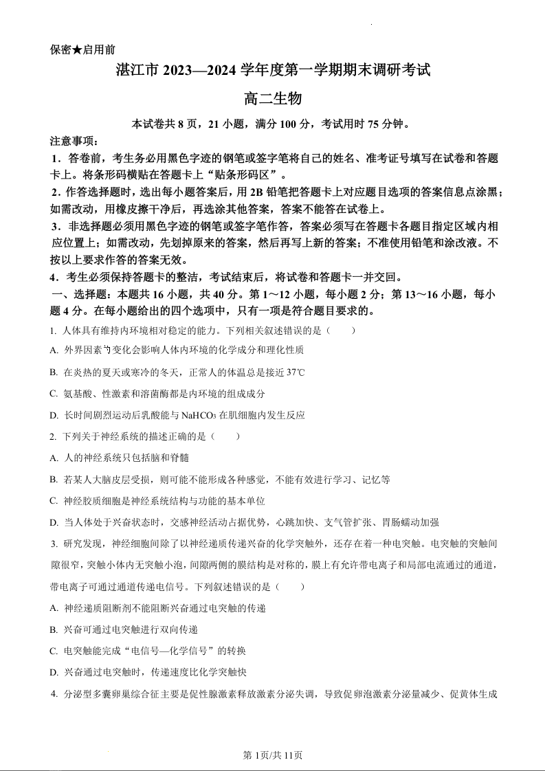 广东省湛江市2023-2024学年高二上学期期末考试生物+答案