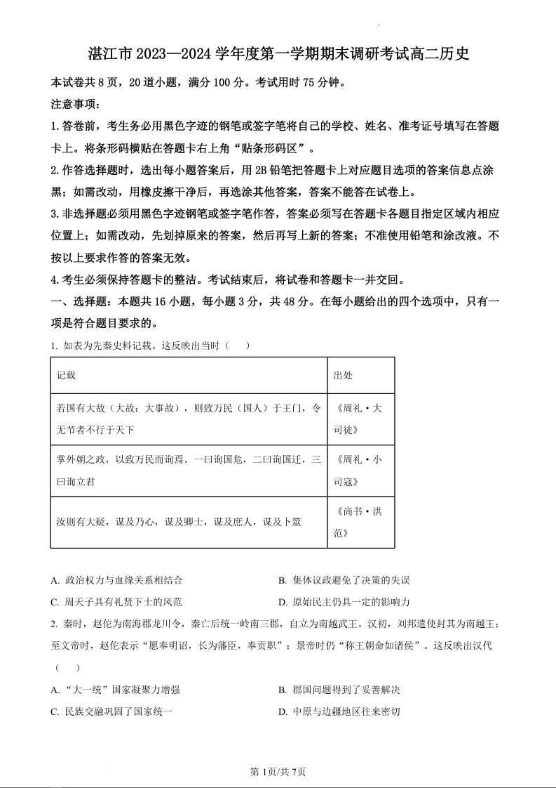 广东省湛江市2023-2024学年高二上学期期末考试历史(原卷版)