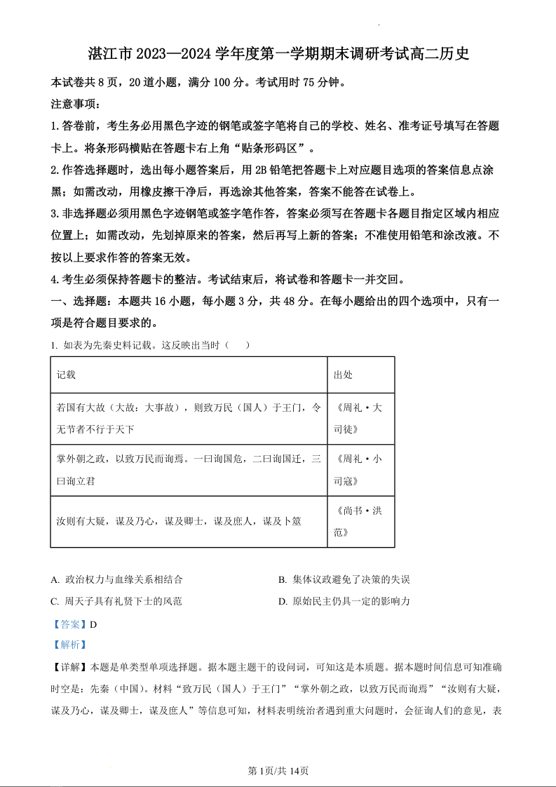 广东省湛江市2023-2024学年高二上学期期末考试历史(精品解析版)