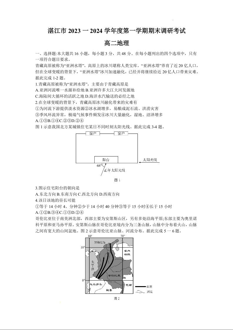 广东省湛江市2023-2024学年高二上学期期末考试地理+答案