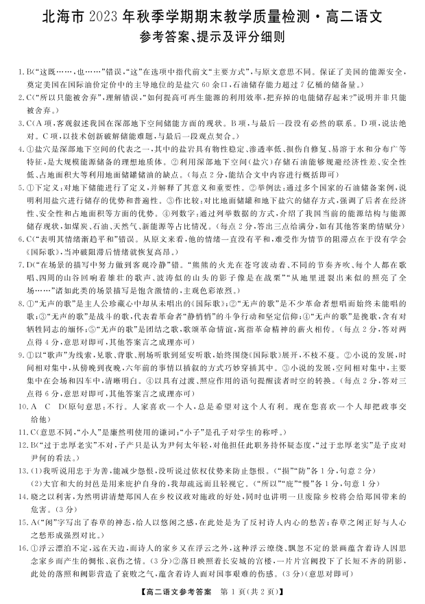 广西北海市2023-2024学年高二上学期期末考试语文答案