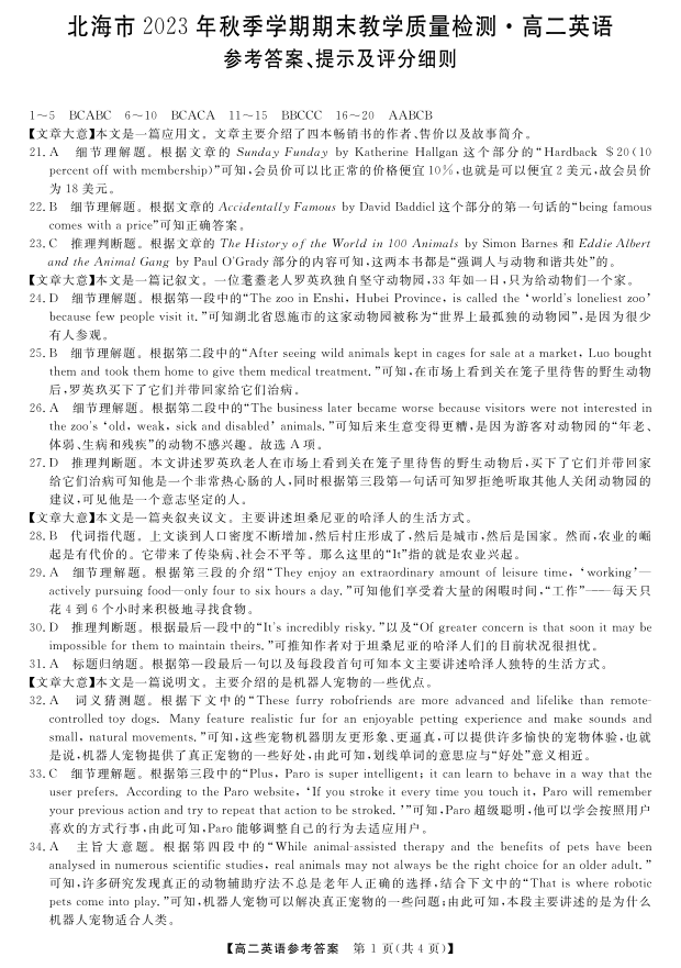 广西北海市2023-2024学年高二上学期期末考试英语答案