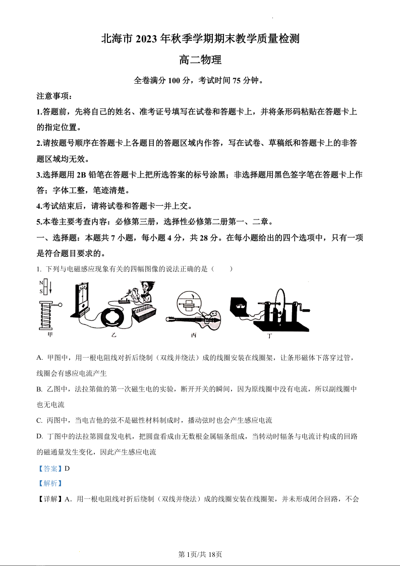 广西北海市2023-2024学年高二上学期期末考试物理(精品解析版)