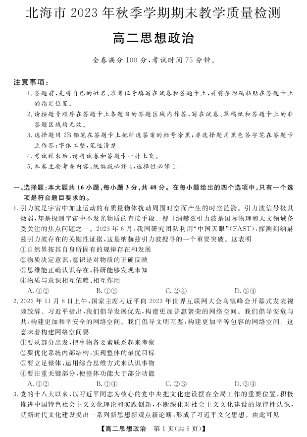广西北海市2023-2024学年高二上学期期末考试政治