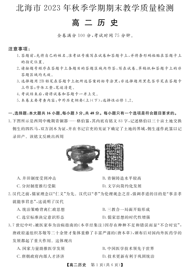 广西北海市2023-2024学年高二上学期期末考试历史