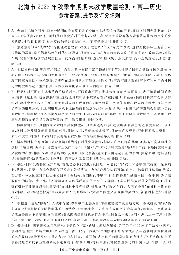 广西北海市2023-2024学年高二上学期期末考试历史答案