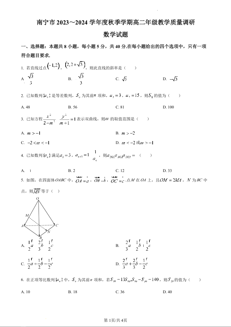 广西南宁市2023-2024学年高二上学期期末联考数学(原卷版)