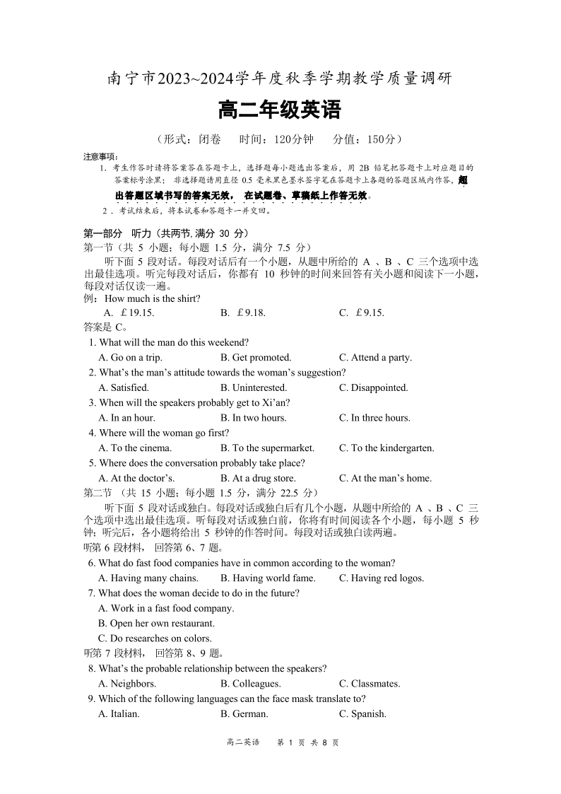 广西南宁市2023-2024学年高二上学期期末联考英语