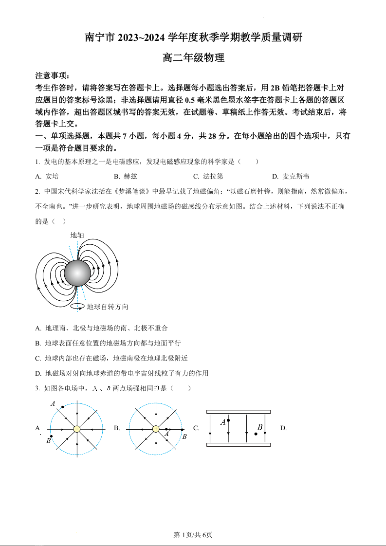 广西南宁市2023-2024学年高二上学期期末联考物理(原卷版)