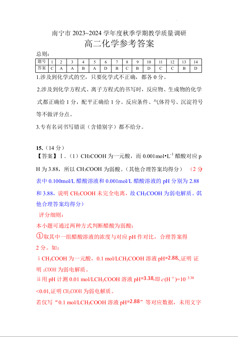 广西南宁市2023-2024学年高二上学期期末联考化学答案