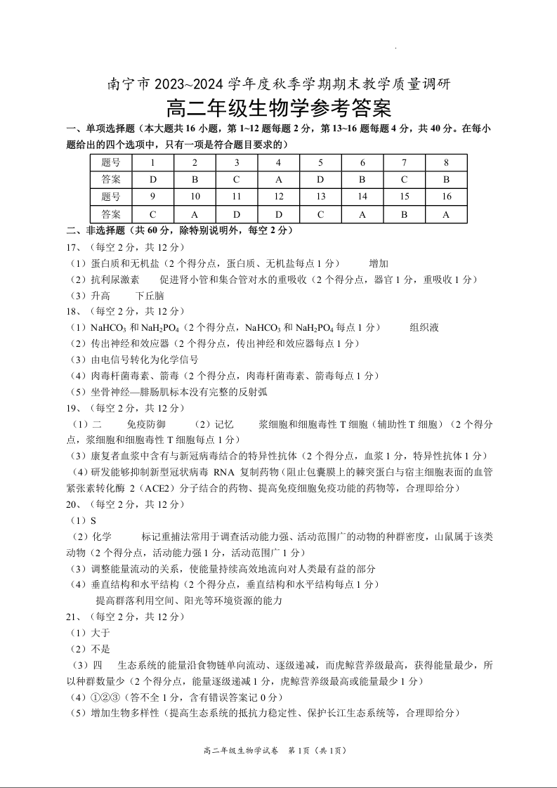 广西南宁市2023-2024学年高二上学期期末联考生物答案