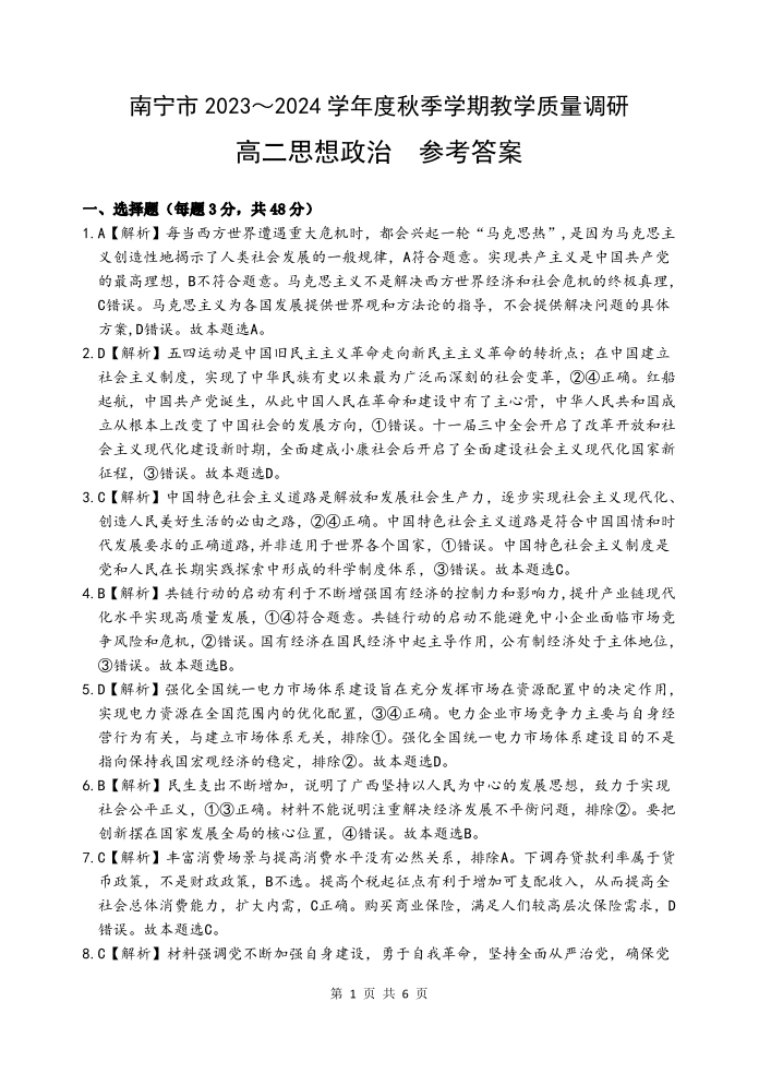 广西南宁市2023-2024学年高二上学期期末联考政治答案