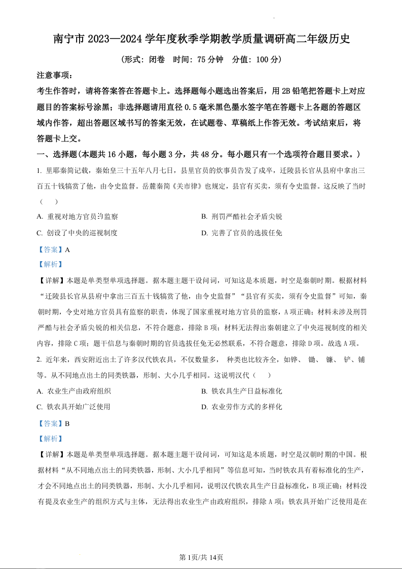 广西南宁市2023-2024学年高二上学期期末联考历史(精品解析版)