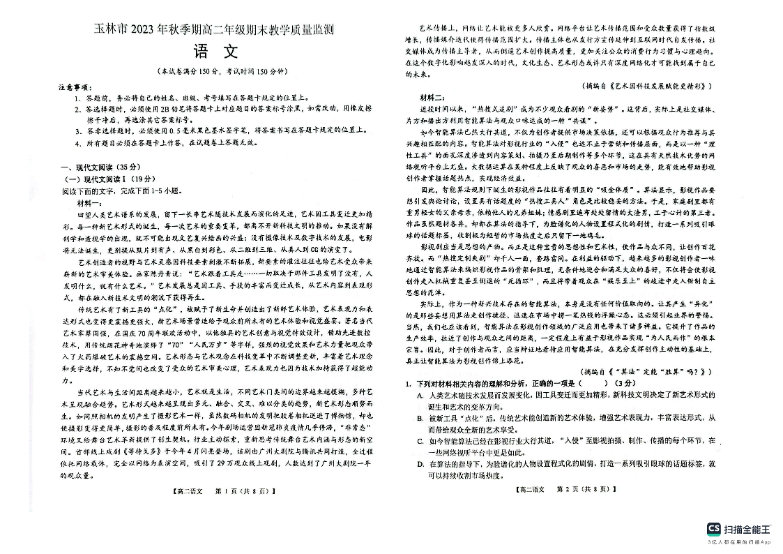 广西玉林市2023-2024学年高二上学期1月期末考试语文