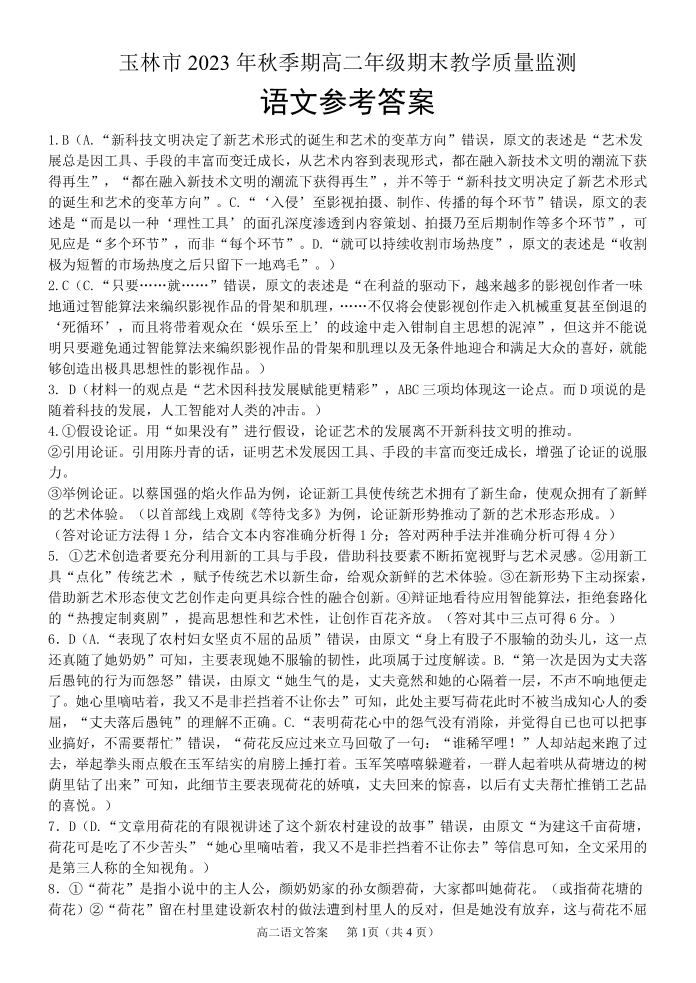 广西玉林市2023-2024学年高二上学期1月期末考试语文答案