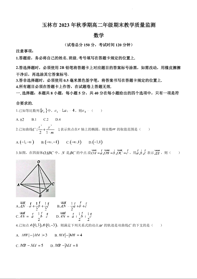 广西玉林市2023-2024学年高二上学期1月期末考试数学+答案