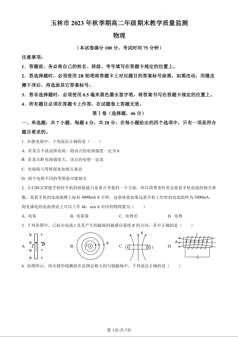 广西玉林市2023-2024学年高二上学期1月期末考试物理(原卷版)