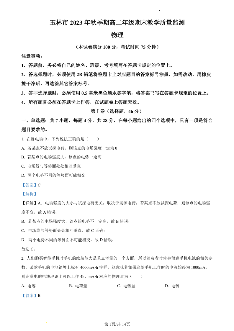 广西玉林市2023-2024学年高二上学期1月期末考试物理(精品解析版)