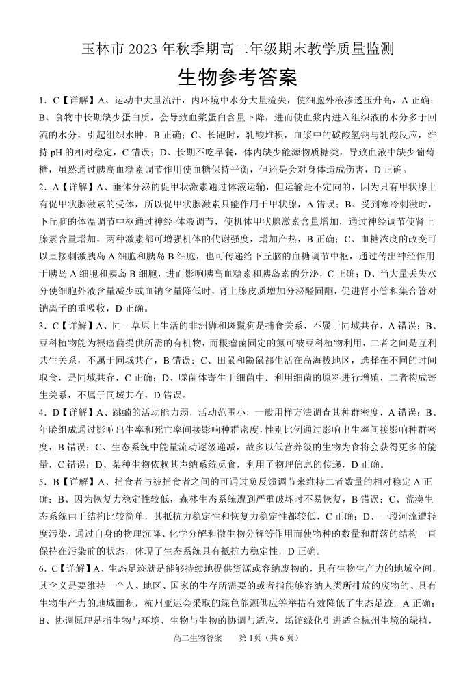 广西玉林市2023-2024学年高二上学期1月期末考试生物答案