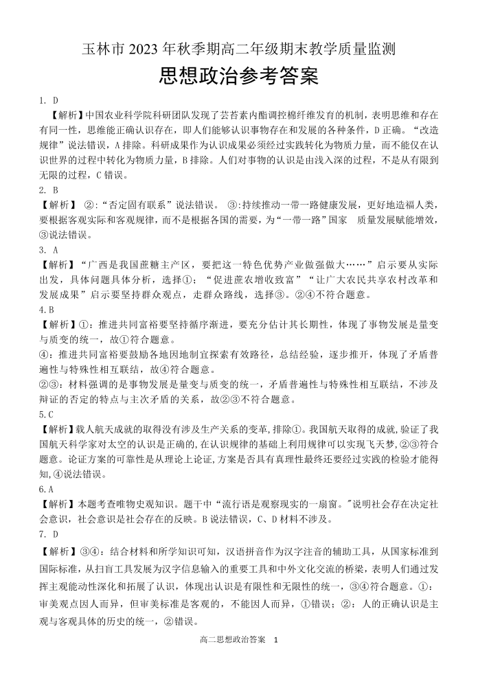 广西玉林市2023-2024学年高二上学期1月期末考试政治答案