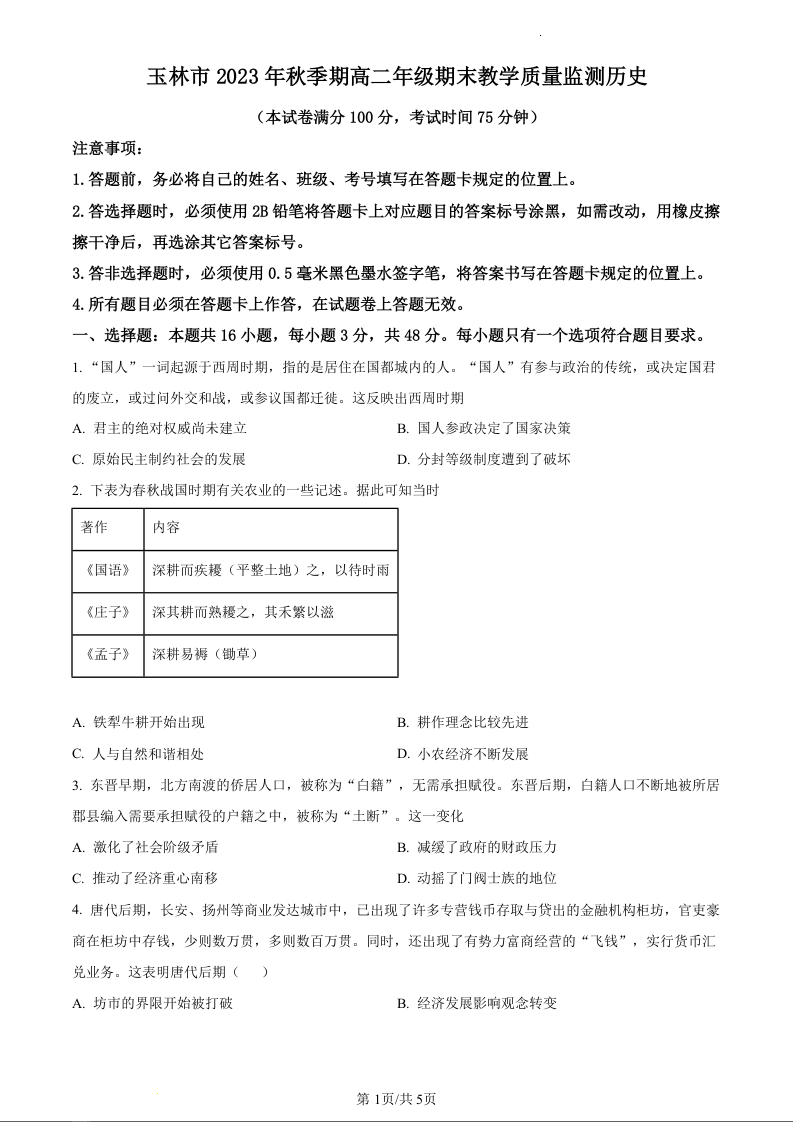 广西玉林市2023-2024学年高二上学期1月期末考试历史(原卷版)