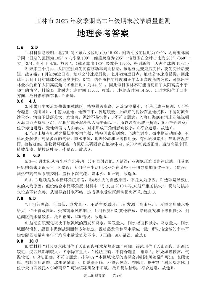 广西玉林市2023-2024学年高二上学期1月期末考试地理答案