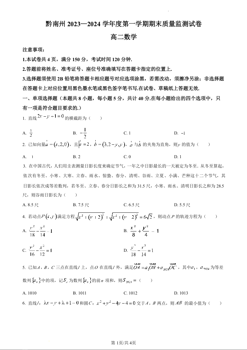 贵州省黔南州2023-2024学年高二上学期期末质量监测数学(原卷版)