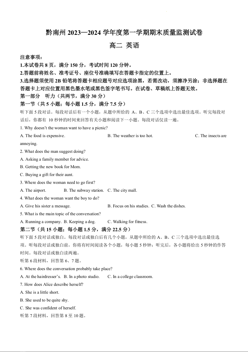 贵州省黔南州2023-2024学年高二上学期期末质量监测英语