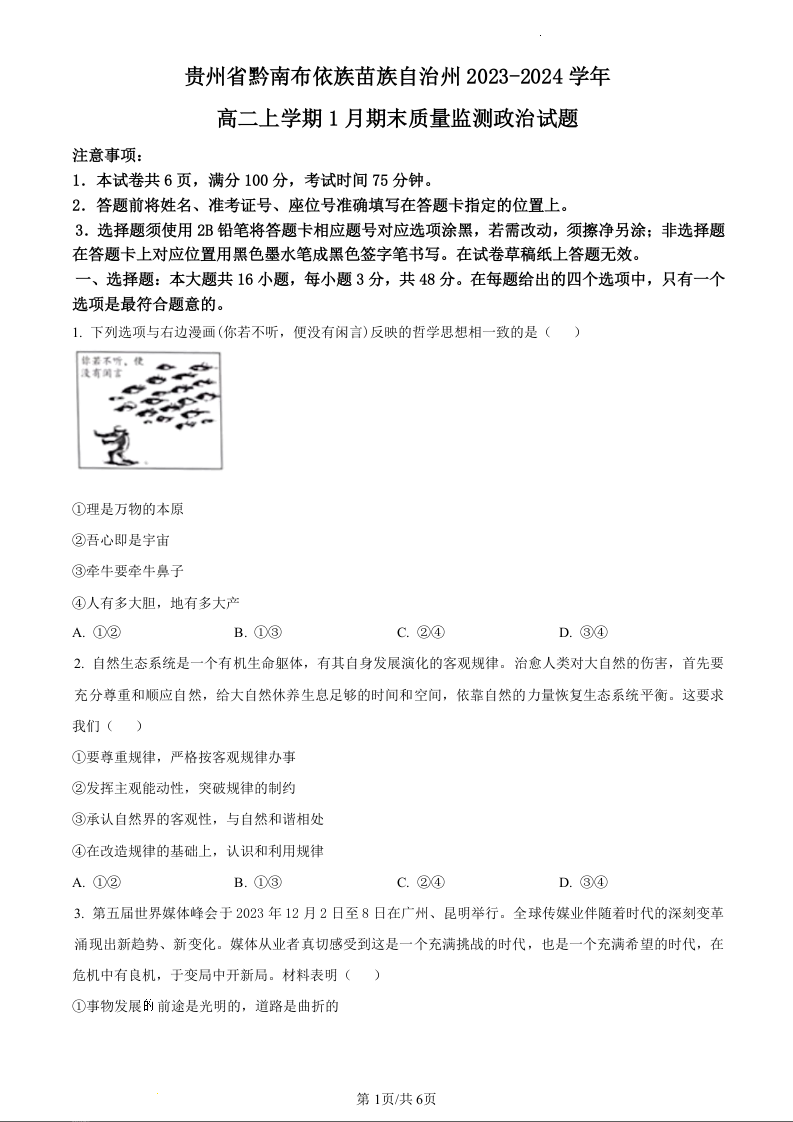 贵州省黔南州2023-2024学年高二上学期期末质量监测政治(原卷版)